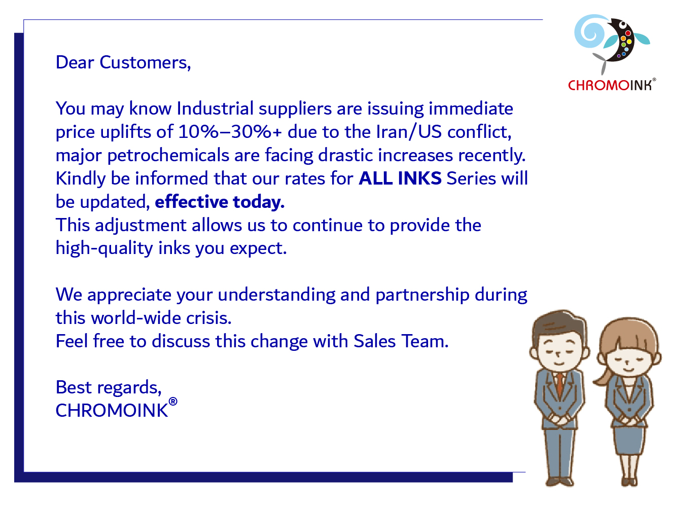 As a subsidiary of Chengfeng Group, we focus on digital printing ink manufacturing. Our "CHROMOINK" brand was established in 2002.