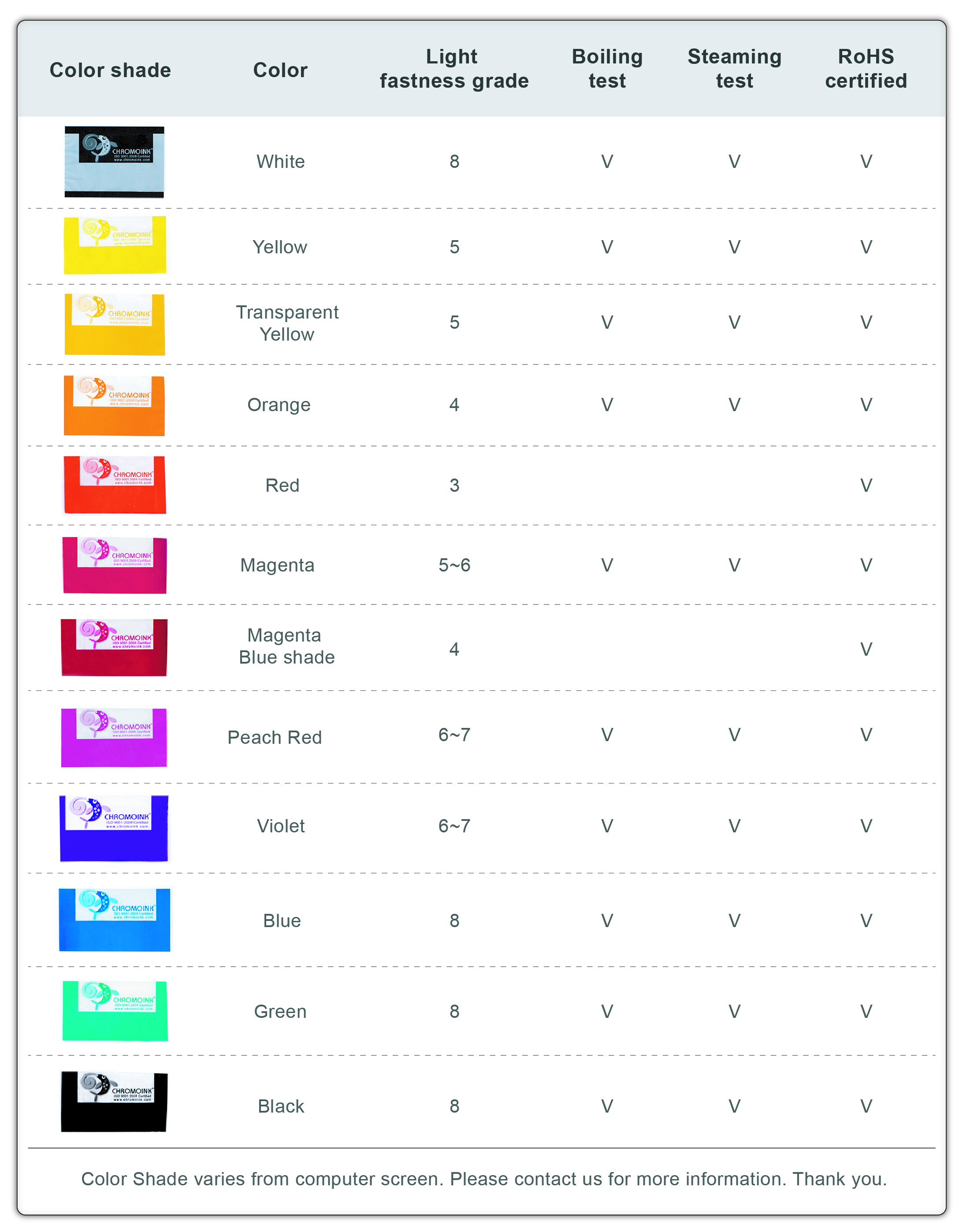 Standard Color & Characteristic (Color pastes dilute 1:1):