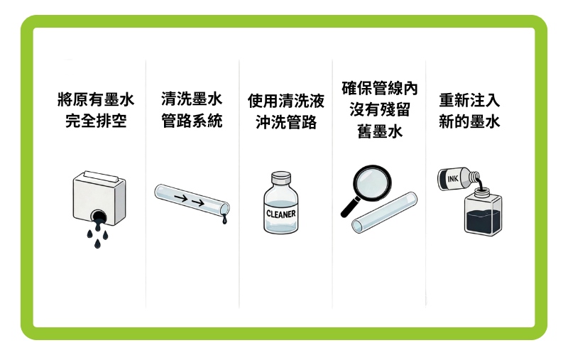 透過完整的清洗與轉換流程,可以有效降低不同墨水之間產生化學反應的風險,並確保設備在新墨水系統下維持最佳運作狀態。