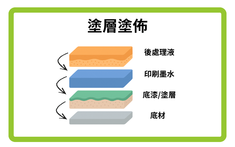 在實際印刷結構中,有些底材上會先增加塗層,以改善墨水的吸附與顯色表現;其上再施加印刷墨水層,形成主要的影像色彩。若應用環境或耐候需求較高,則可再覆上一層後處理液(Vanish),進一步提升防刮性與耐久度。對於玻璃或金屬材質,印前噴塗專用底漆可顯著增強耐刮力與附著效果。
