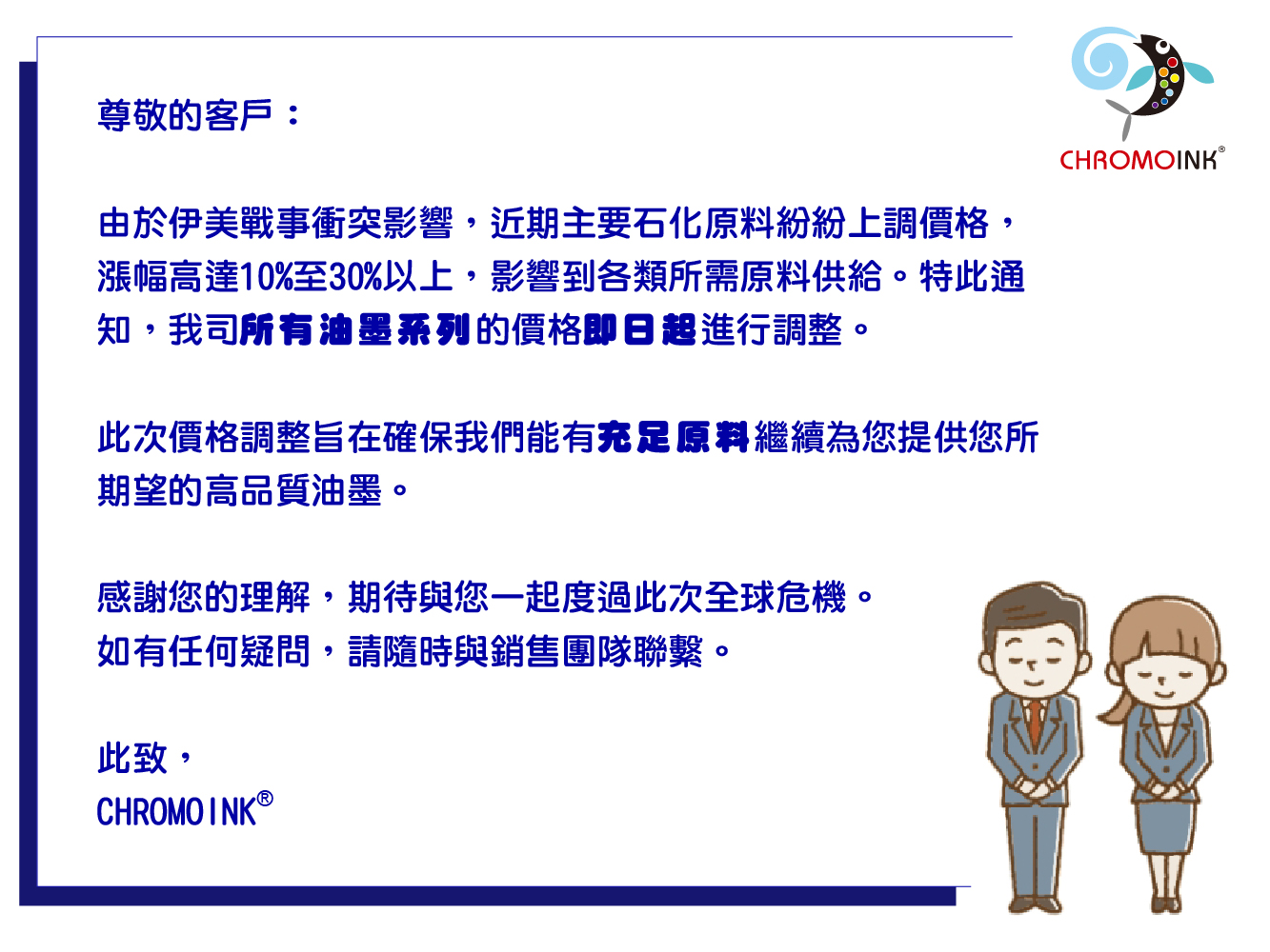 豐彩公司於1983年成立,通過ISO 9001:2015認證,為清豐集團子公司,專注於數位印刷墨水製造。自2002年起,我們的“CHROMOINK”品牌在市場上嶄露頭角。我們產品包括LED UV固化墨水、UV固化墨水、環保溶劑墨水、昇華墨水、紡織墨水以及水性凹印/柔版印刷油墨。我們與國家研究機構和全球企業家合作,秉持創新與發展,以滿足客戶需求並關注環保議題。
